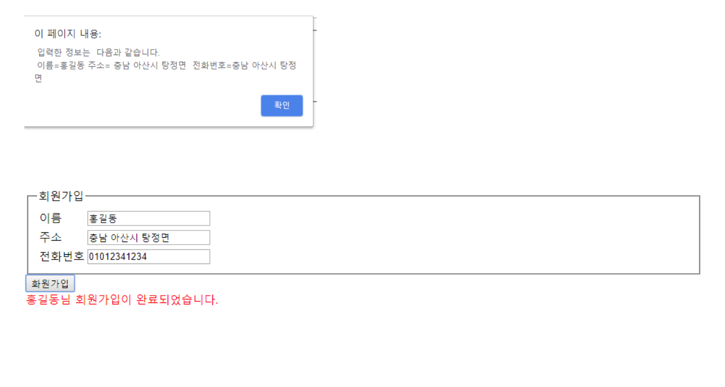 alert("입력하신 정보는 다음과 같습니다.\n"+"이름 :"+ name+" 주소 :"+ address+" 전화번호 :"+ phone);