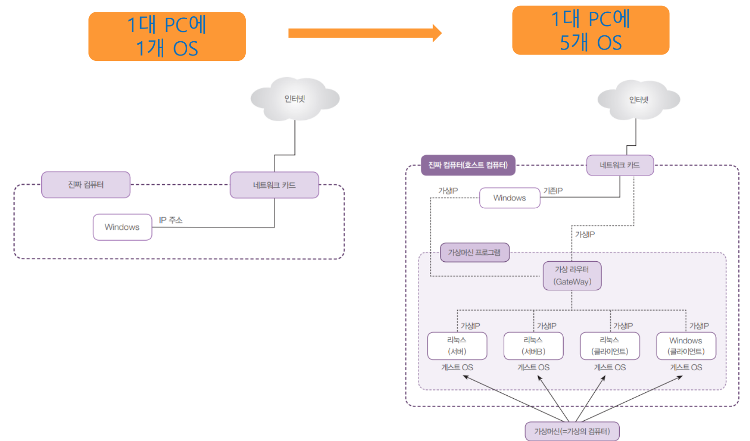 - 1대의 컴퓨터만으로 다른 OS의 환경을 이용하거나 실무환경과 거의 비슷한 네트워크 컴퓨터 환경을 구성가능하다.
