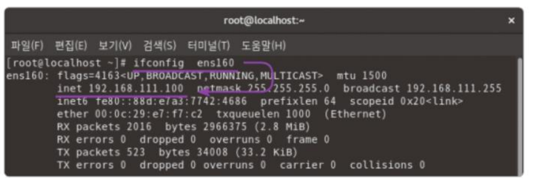 - 재부팅 후 ifconfig ens160 명령으로 네트워크 정보를 확인해본다.