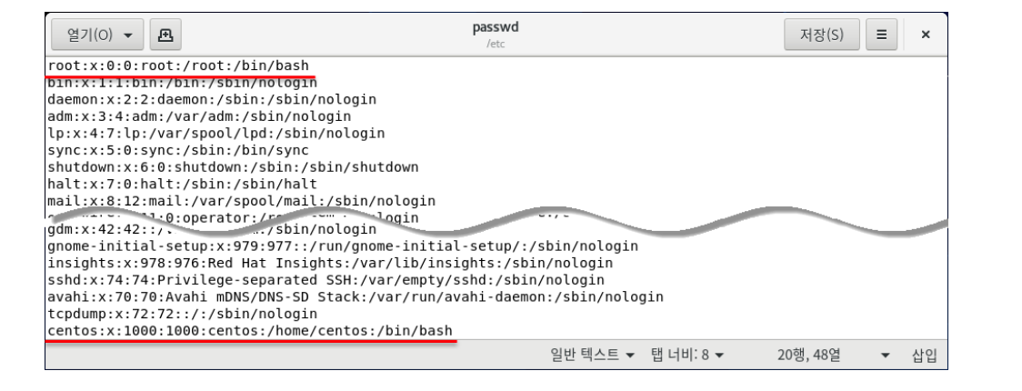 사용자이름:패스워드:사용자ID:사용자 소속그룹ID:홈 디렉토리:기본 셀